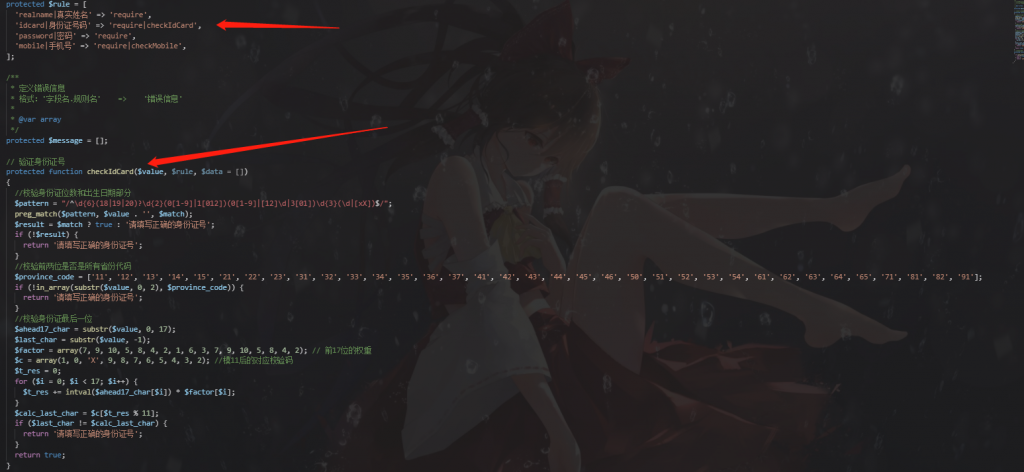 ‘idcard|身份证号码’ => ‘require|checkIdCard’,